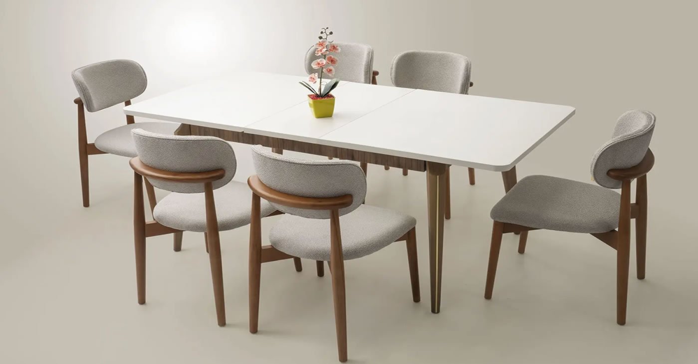 Our product consists of a set of Mirrorless Console, Console Mirror, Table and 6 Chairs. Our products are produced with first class workmanship and are made of wood and MDF. All color options are available. It has the feature of being opened and closed. | Console 180 - 45 - 82 | The table measures 92 - 190 - 90. Polo Chair
